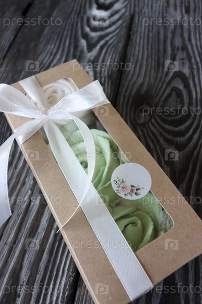 Домашний зефир в бумажных подарочных коробках. Зефирные цветы. Коробочки перевязываются лентой, завязанной в бантик