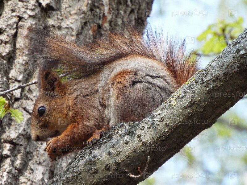 Белка сидит на ветке дерева и грызет орех