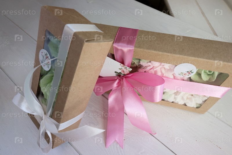 Две коробки с зефиром. Домашний зефир в бумажной подарочной упаковке. Зефирные цветы. Коробочка перевязана лентой, завязанной в бантик. Метка для текста. Рядом поздравительная открытка