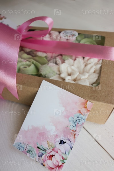Домашний зефир в бумажной подарочной упаковке. Зефирные цветы. Коробочка перевязана лентой, завязанной в бантик. Метка для текста. Рядом поздравительная открытка. Крупный план