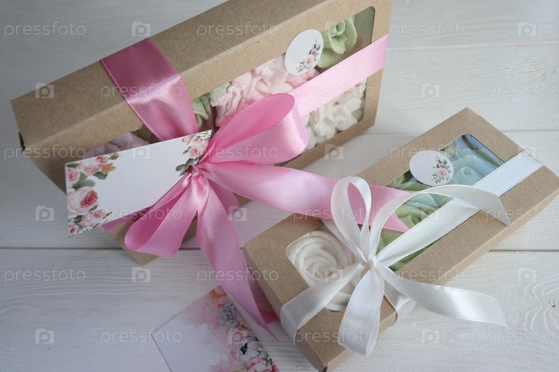 Две коробки с зефиром. Домашний зефир в бумажных подарочных коробках. Зефирные цветы. Коробочки перевязываются лентой, завязанной в бантик. Метка для текста