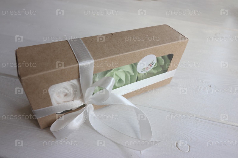 Домашний зефир в бумажных подарочных коробках. Зефирные цветы. Коробочки перевязываются лентой, завязанной в бантик. Метка для текста