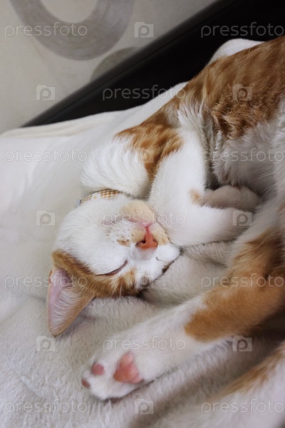 Рыжий котенок. Он спит, свернувшись калачиком. Картинка сверху. Крупный план