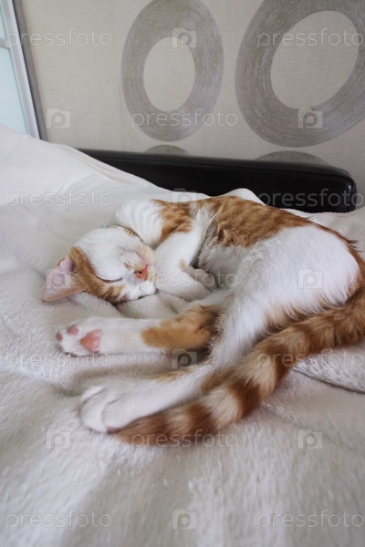 Рыжий котенок. Он спит, свернувшись калачиком