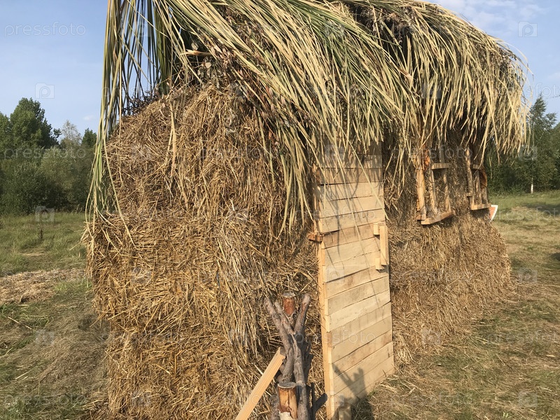 Дом из соломы и травы с деревянными элементами. Временные украшения к празднику урожая