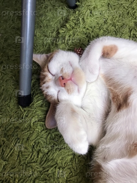 Рыжий кот с белыми пятнами. Он спит в странной позе. На зеленом ковре