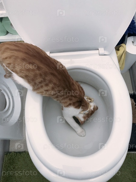 Рыжий кот с белыми пятнами. Он залезает в туалет