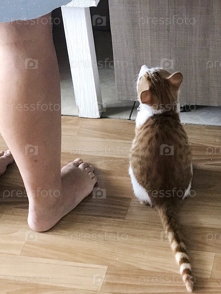 Рыжий кот с белыми пятнами. Сидит у ног хозяйки