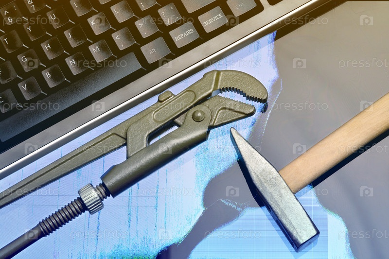 Сервисный ремонт компьютерной техники. Регулируемая клавиша, молоток на клавиатуре и разбитый экран монитора