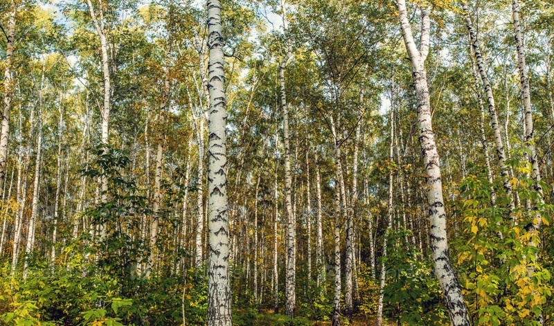 Осенний березовый лес, освещенный вечерним солнцем. Фон стволов березы