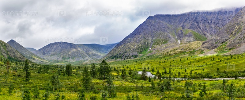 Долина и горы на Приполярном Урале в летний день