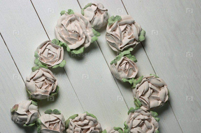 Цветы из зефира. Домашний зефир. Выложен в форме сердца. На белых досках. Снято сверху