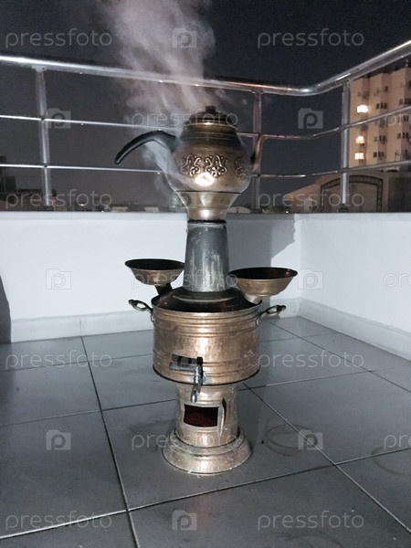 Турецкий тепловой самовар на дровах. Есть чайник. От него идет дым. На улице темно