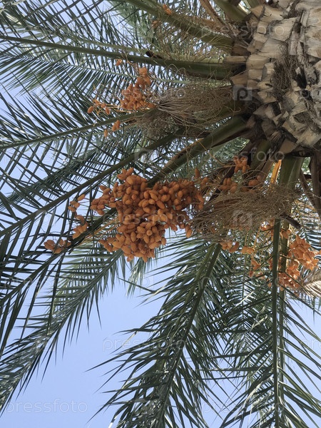Финиковая пальма. Финики. На фоне неба. Крупный план