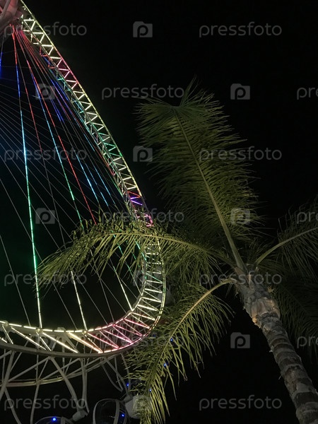 Фрагмент колеса обозрения в городском парке. С разноцветной подсветкой. Проливающая пальма. На фоне ночного неба