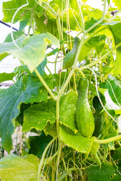 В саду выросли свежие вкусные зеленые огурцы. овощи. fresh delicious green cucumbers have grown in the garden. vegetables