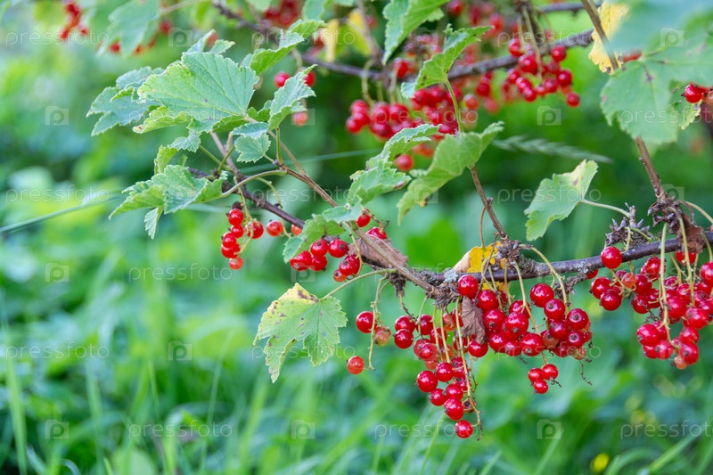 Большие спелые ягоды красной смородины созрели на садовом участке