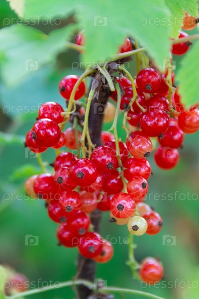 Большие спелые ягоды красной смородины созрели на садовом участке