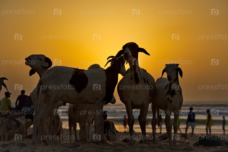 Западная Африка. Сенегал. Силуэты небольшого стада коз Нубийской породы на фоне закатного тропического солнца