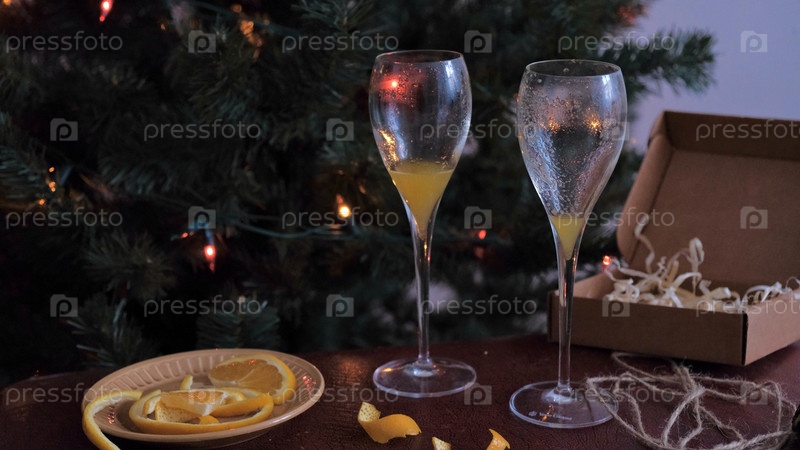 Съеденные апельсины, открытый подарок и коктейль «Мимоза» на столе