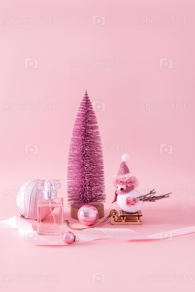 Новогодняя презентация аромата женских духов в шикарном флаконе на розовом фоне среди декоративных новогодних элементов. Вертикальный вид