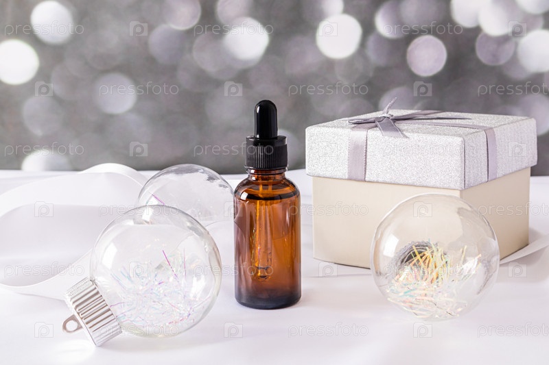 Коричневая стеклянная пипетка с косметическим продуктом на рождественском фоне с праздничной коробкой, стеклянными шариками, световым эффектом боке. Пустая упаковка для бутылок