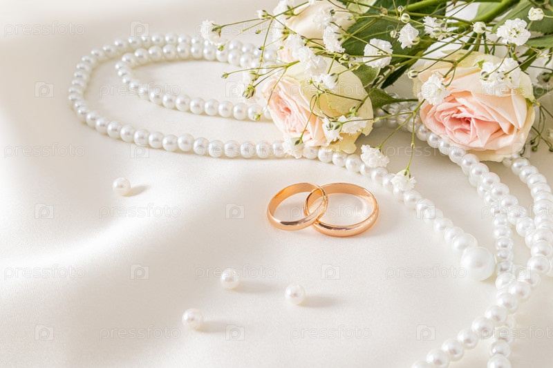 Нежная свадебная композиция из двух обручальных золотых колец на кремовом атласном фоне с жемчужными бусинами и цветами. открытка. приглашение. крышка