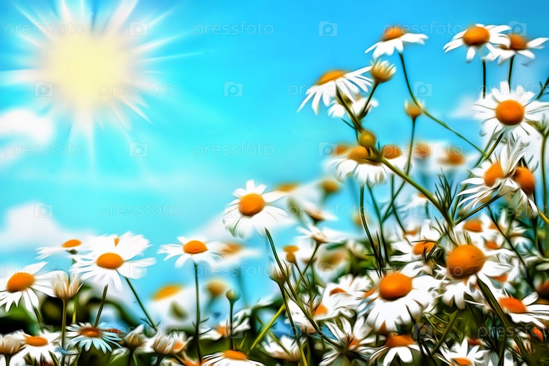 Иллюстрация белых цветущих ромашек крупным планом на фоне голубого неба
