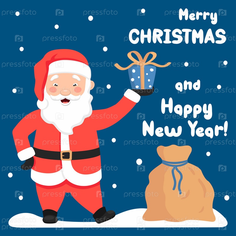 Открытка с Рождеством и Новым годом. Милый Санта-Клаус стоит возле мешка с подарками и держит в руках подарочную коробку