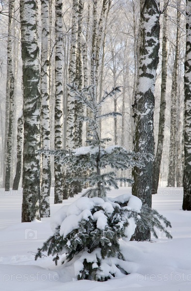 Маленькая елочка на фоне березовой рощи