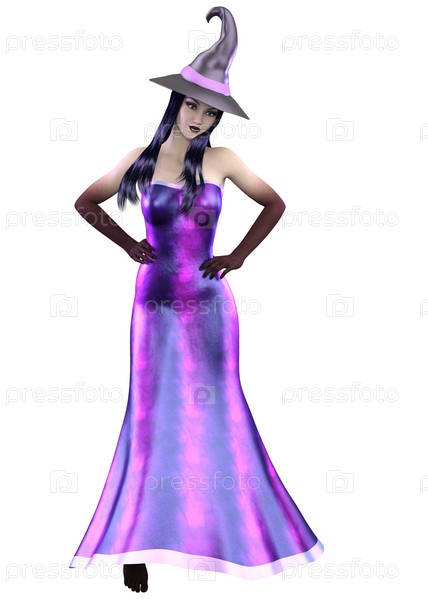3D-рендеринг ведьмы в фиолетовом длинном платье