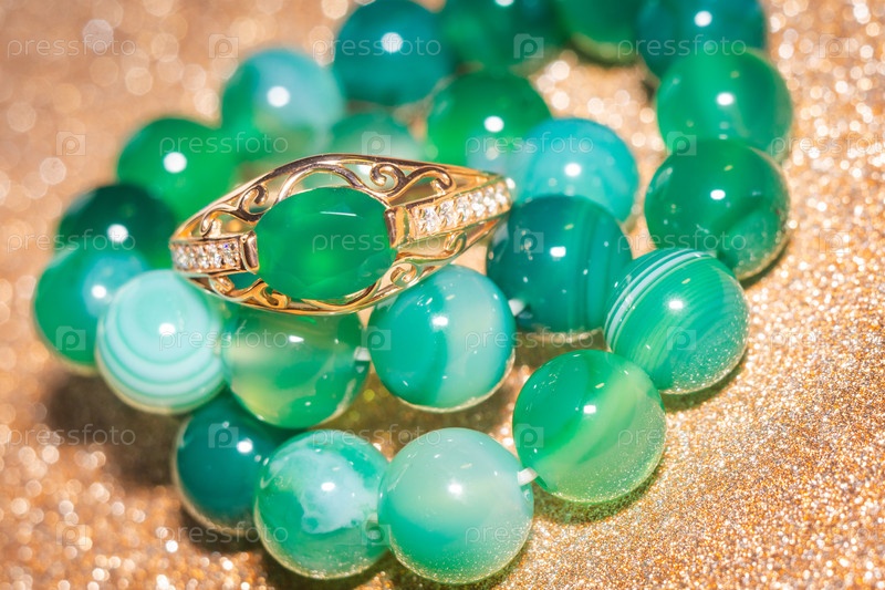 Золотое кольцо с зеленым агатом и браслетом из бисера