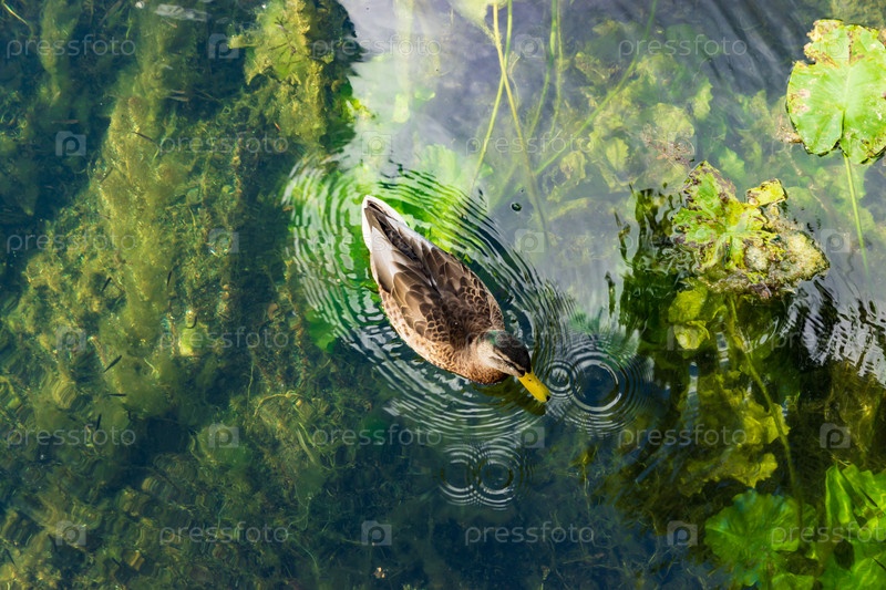 Утка плавает в пруду