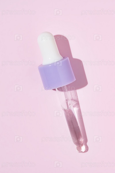 Вид сверху на стеклянную пипетку с прозрачной сывороткой гиалуроновой кислоты для ухода за кожей, расположенную на розовом фоне с солнечным светом