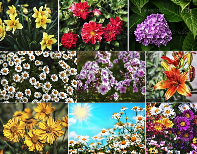Набор иллюстраций яркого разноцветного цветочного фона природы в винтажном стиле