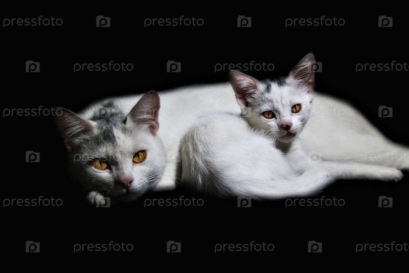 Белая кошка лежит рядом со своим котенком на черном фоне