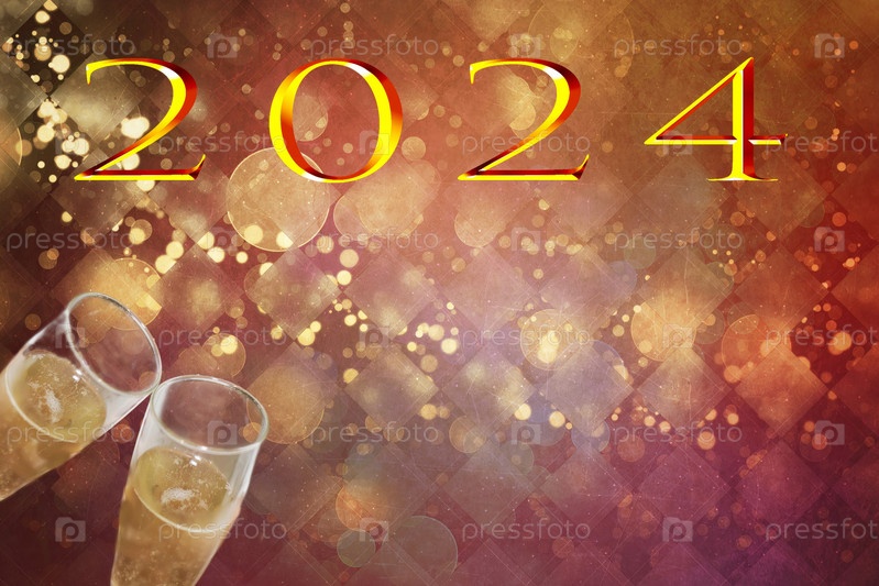 Новый 2024 год, золотой текст на красном фоне и расфокусированные огни, тост с бокалами шампанского