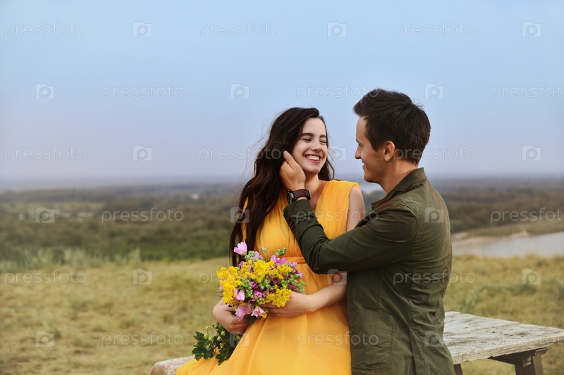 Беременная девушка в желтом платье и с цветами смеется с мужчиной