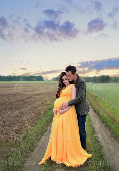 Беременная девушка с молодым человеком обнимаются, стоя рядом с полем на закате