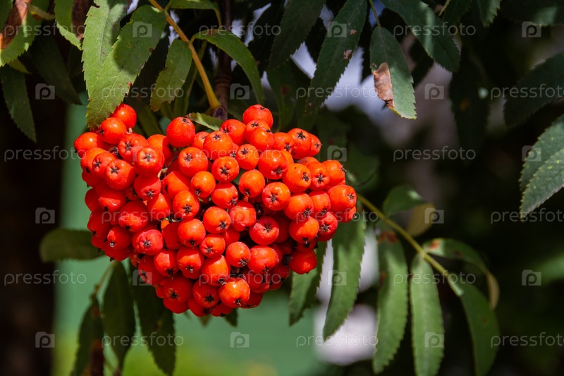 Рябина.Созревшие ярко-оранжевые виноградные лозы рябин на ветках. Ашберри.Зрелые ярко-оранжевые скопления горного пепла на ветвях