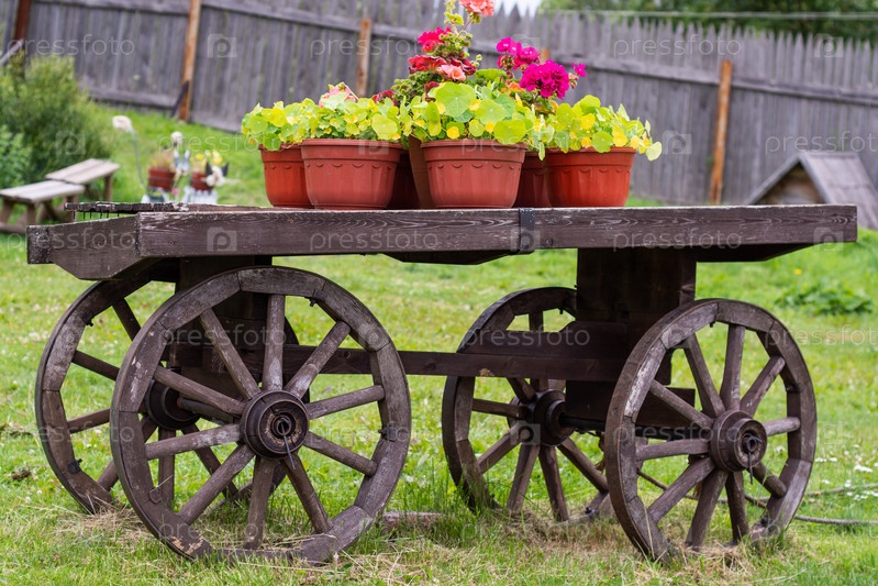 Деревянная тележка с цветами. На деревянной тележке кашпо с цветками. Красиво оформленная территория. Wooden cart with flowers. There are pots with flowers on a wooden cart. Beautifully decorated territory