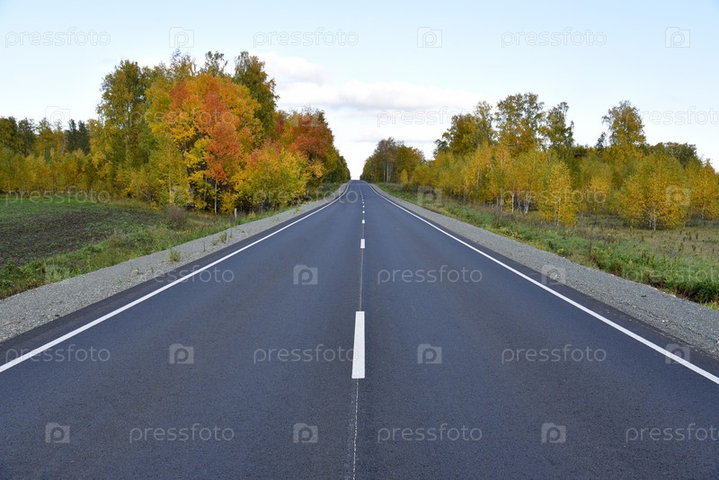 Красивая осенняя асфальтированная дорога через лес. Шоссе — дорога в красивой сельской местности