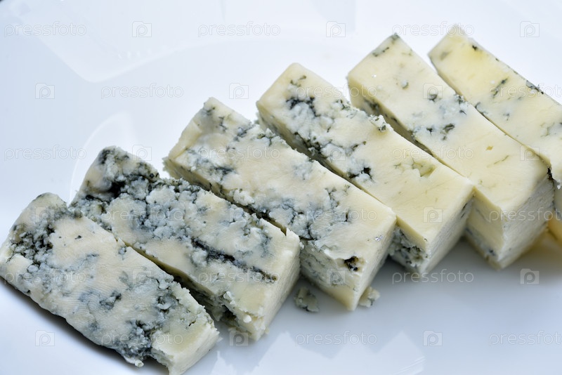 Нарезанный сыр с голубой плесенью на белой тарелке. Вкусный завтрак с сыром