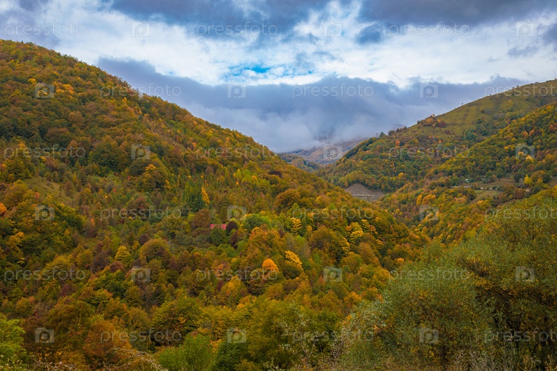 Теплая осень в горах, покрытых яркими осенними деревьями. Красочный пейзаж
