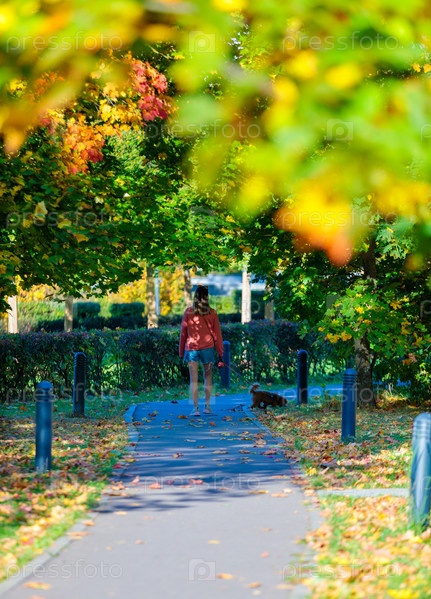 Женщина выгуливает собаку по тротуару в городском парке в солнечный день