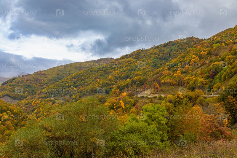 Теплая осень в горах, покрытых яркими осенними деревьями. Красочный пейзаж