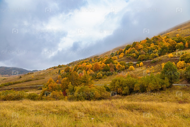 Теплая осень в горах, покрытых яркими осенними деревьями. Красочный пейзаж