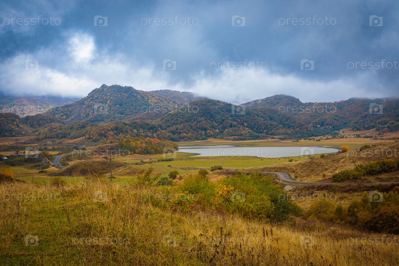 Густые облака скатываются с гор и кружатся ветром. Осенний пейзаж в горах возле озера