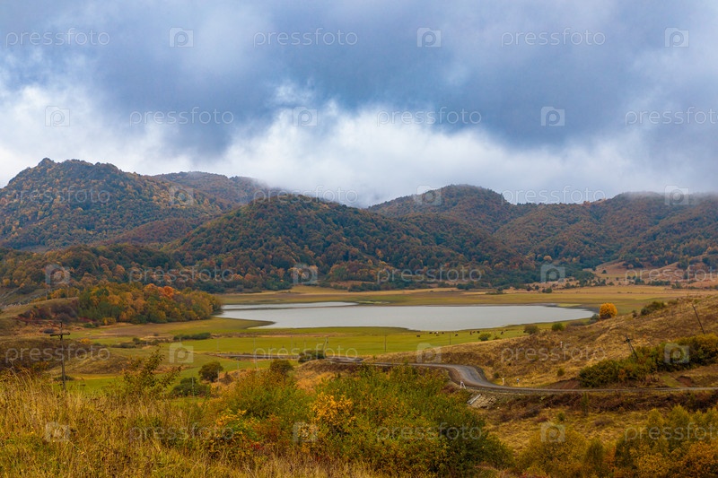 Густые облака скатываются с гор и кружатся ветром. Осенний пейзаж в горах возле озера