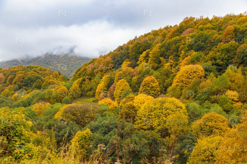 Теплая осень в горах, покрытых яркими осенними деревьями. Красочный пейзаж